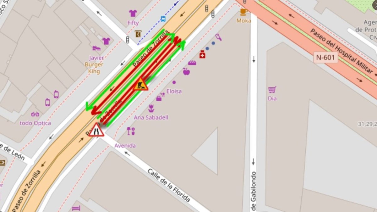 En sentido centro de la ciudad se tendrán que cortar los carriles central y derecho (carril bus) de la calzada principal del paseo de Zorrilla, por lo que todo el tráfico tendrá que discurrir por el izquierdo, o bien por el auxiliar, si bien en éste se obliga a girar a la derecha en Hospital Militar.