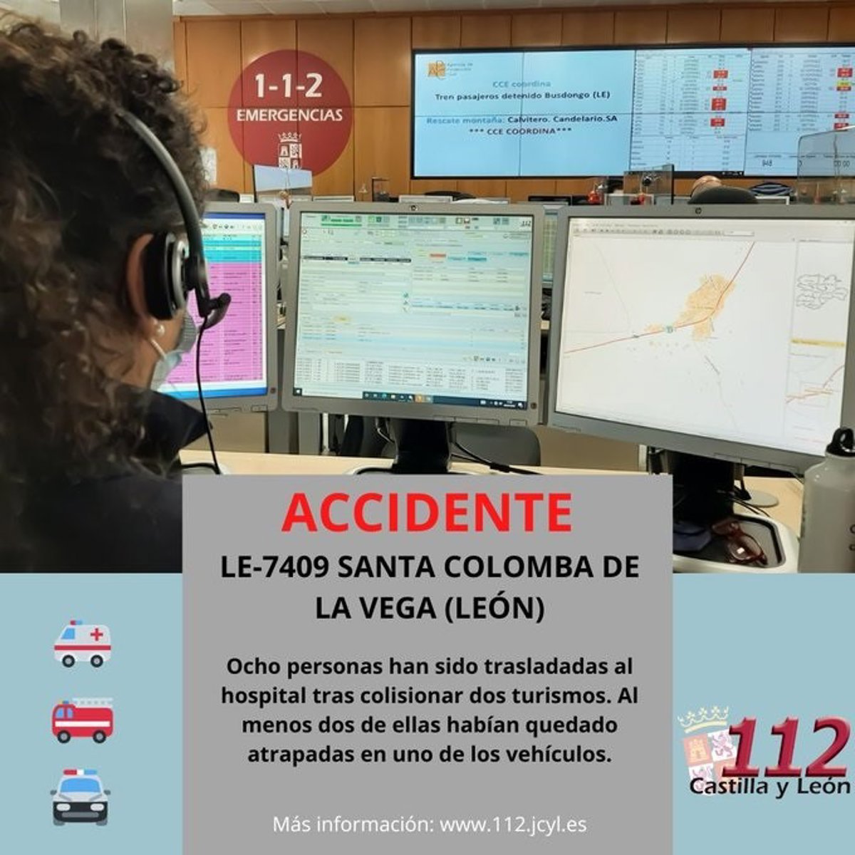 El centro de emergencias 112 dio aviso del incidente a Guardia Civil de Tráfico, a bomberos de León, a los bomberos de la diputación de León, y a Emergencias Sanitarias - Sacyl, que envió una UVI móvil, y dos ambulancias de soporte vital básico.