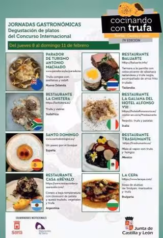 Las Jornadas Gastronómicas forman parte del programa de actividades en torno al Concurso Internacional 'Cocinando con Trufa', organizado por la Consejería de Cultura, Turismo y Deporte, en colaboración con el Ayuntamiento de Soria y la Diputación, con el apoyo de la Asociación de Empresarios de Hostelería y Turismo de Soria (Asohtur).