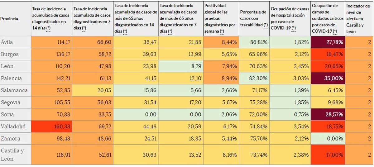 Indicadores del semáforo COVID en Castilla y León y sus provincias. - JCYL
