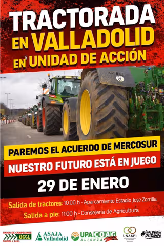 La tractorada de Valladolid está secundada por Asaja, UPA, COAG, UCCL y la Unión Nacional de Asociaciones del Sector Primario Independientes (Unaspi) bajo el hashtag 'Por la unidad del campo' y el lema 'Paremos el acuerdo de Mercosur. Nuestro futuro está en juego' y se prolongará hasta las 18.00 horas.