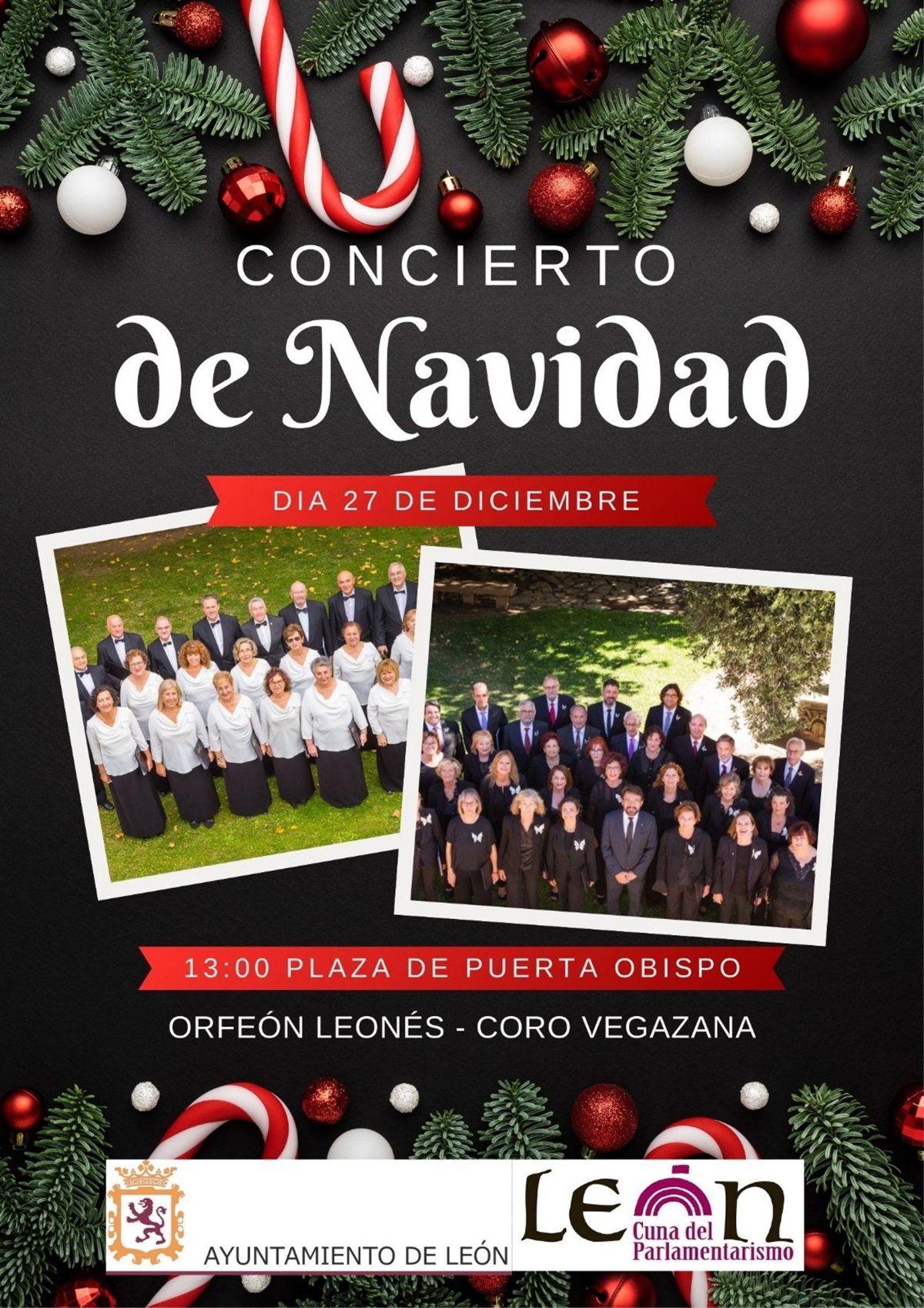 La programación musical de la Navidad en León continúa el próximo sábado día 27 con un concierto de Orfeón Leonés y el Coro Vegazana, una cita de la programación navideña de la ciudad que tendrá como escenario la plaza de Puerta Obispo a las 13.00 horas.