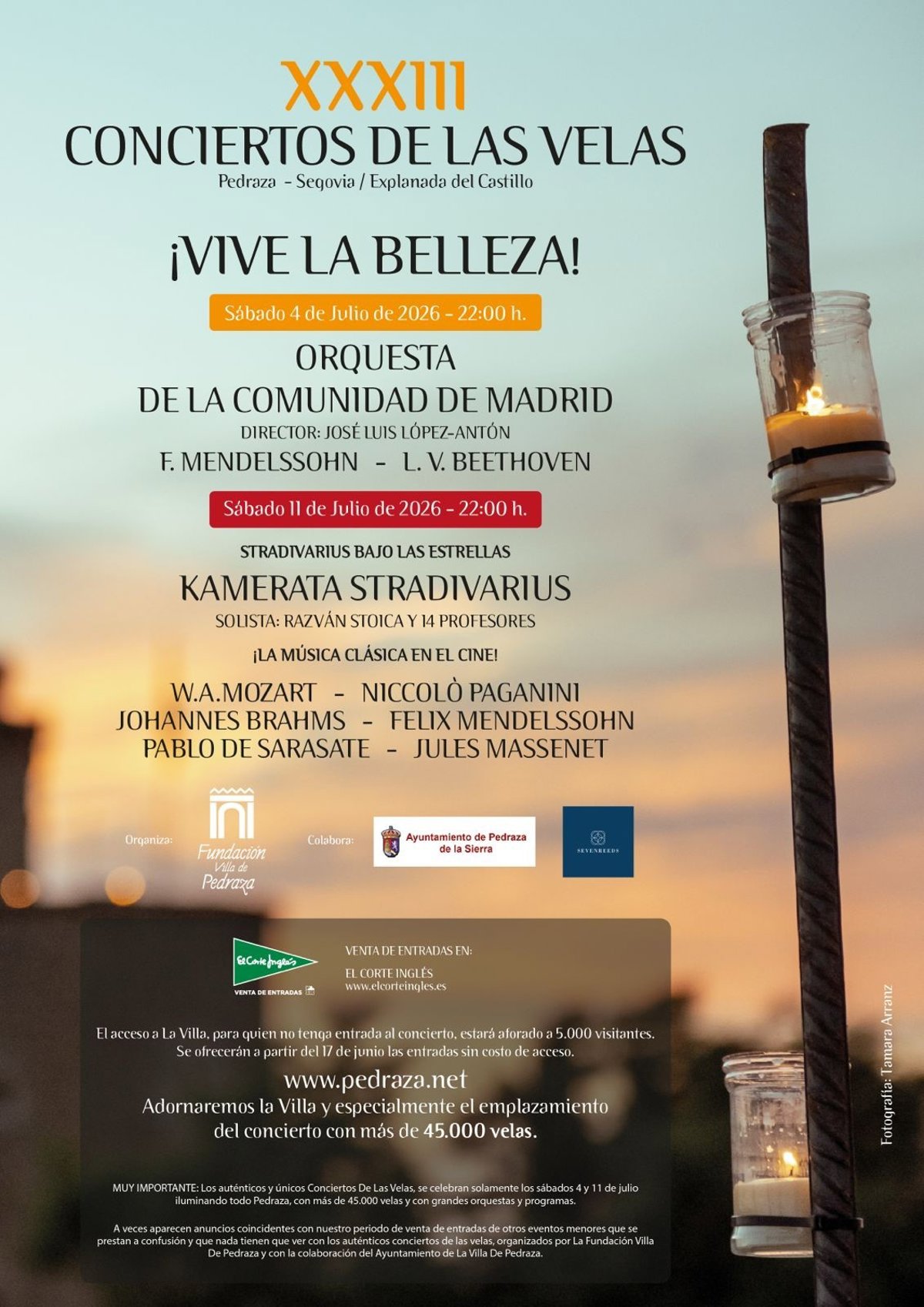 Los Conciertos de las Velas de Pedraza celebran en 2026 su trigésimo tercera edición con la Orquesta de la Comunidad de Madrid, bajo la dirección de José Luis López-Antón, y la Kamerata Stradivarius, con el violinista rumano Razván Stoica como solista y director artístico.