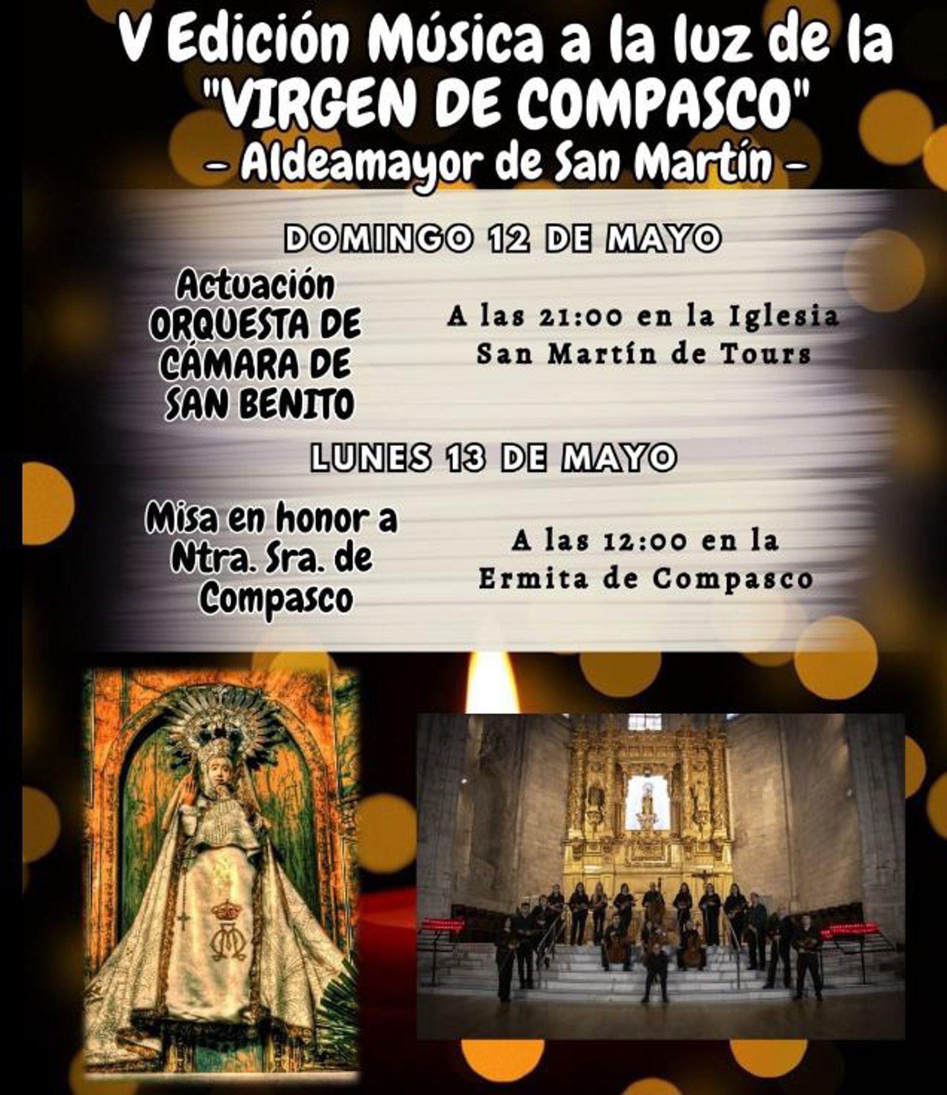 La Orquesta de Cámara de San Benito, de Valladolid capital, protagoniza este domingo, 12 de mayo, el concierto 'Música a la luz de la Virgen de Compasco' que se celebra en Aldeamayor de San Martín en la jornada previa a la celebración de la romería en honor a esta virgen.