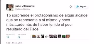 Así se ha expresado el regidor vallisoletano en respuesta a un 'tuit' que publicó este lunes el socialista palentino en el que mostraba sorpresa por "el protagonismo de algún alcalde que se representa a sí mismo y poco más, además de haber tenido el peor resultado del PSOE".