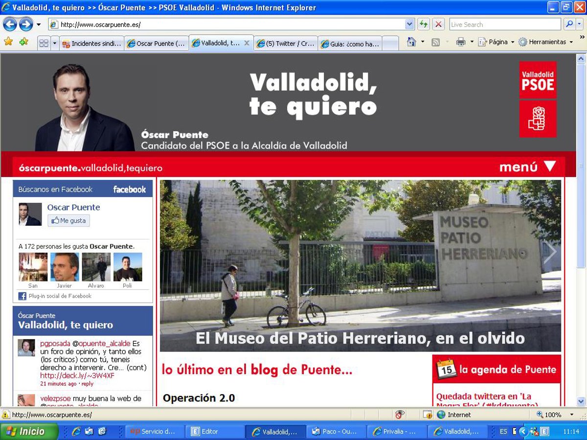 El candidato del PSOE a la Alcaldía de Valladolid y presidente del Grupo Municipal Socialista, Óscar Puente, ha presentado este martes su nuevo espacio en Internet (http://www.oscarpuente.es/) en el que aglutina su presencia en las redes sociales Facebook y Twitter y en el ámbito Blog (elblogdepuente.psoeava.org/).