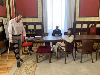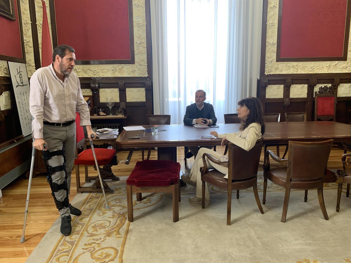 El alcalde de Valladolid, Óscar Puente, ha vuelto este martes al trabajo en su despacho del Ayuntamiento de Valladolid apoyado en unas muletas, con un inmovilizador de rodilla y ha confesado que se ha encontrado mejor de lo esperado, al tiempo que se siente "contento" por poder retomar en parte su agenda.