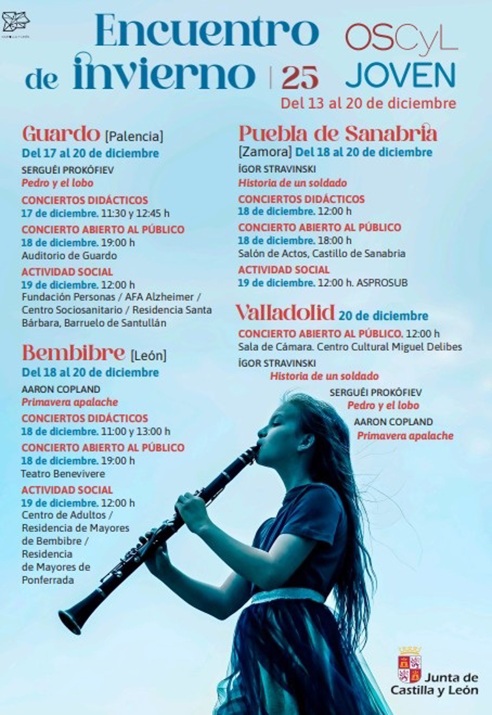 En Puebla de Sanabria (Zamora) las actividades de la OSCyL Joven, con la dirección musical de Javier Huerta Gimeno, se celebrarán del 18 al 20 de diciembre a través de la obra 'Historia de un soldado' de Igor Stravinsky, con un concierto didáctico el jueves 18 por la mañana y un concierto abierto al público el mismo jueves 18, a las 18.00 horas en el Salón de Actos del Castillo.
