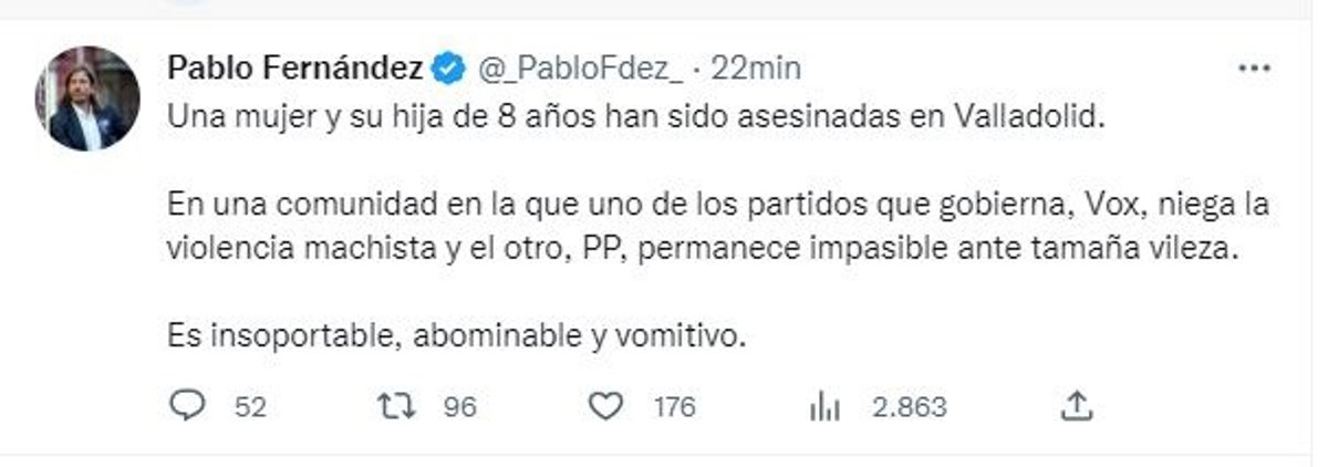 "En una comunidad en la que uno de los partidos que gobierna, Vox, niega la violencia machista, y el otro, PP, permanece impasible ante tamñaza vileza", ha escrito el portavoz de Podemos quien ha asegurado que es "insoportable, abominable y vomitivo".