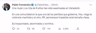 Así lo ha escrito Fernández en su cuenta personal de Twitter tras conocer que han sido encontradas muertas en su casa de Valladolid una mujer y su hija de 8 años, presuntamente asesinadas por la novia de la mujer.