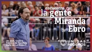 El candidato a la Presidencia del Gobierno de Podemos, Pablo Iglesias, mantendrá un 'encuentro con la gente' este sábado, 20 de abril, en la localidad burgalesa de Miranda de Ebro.