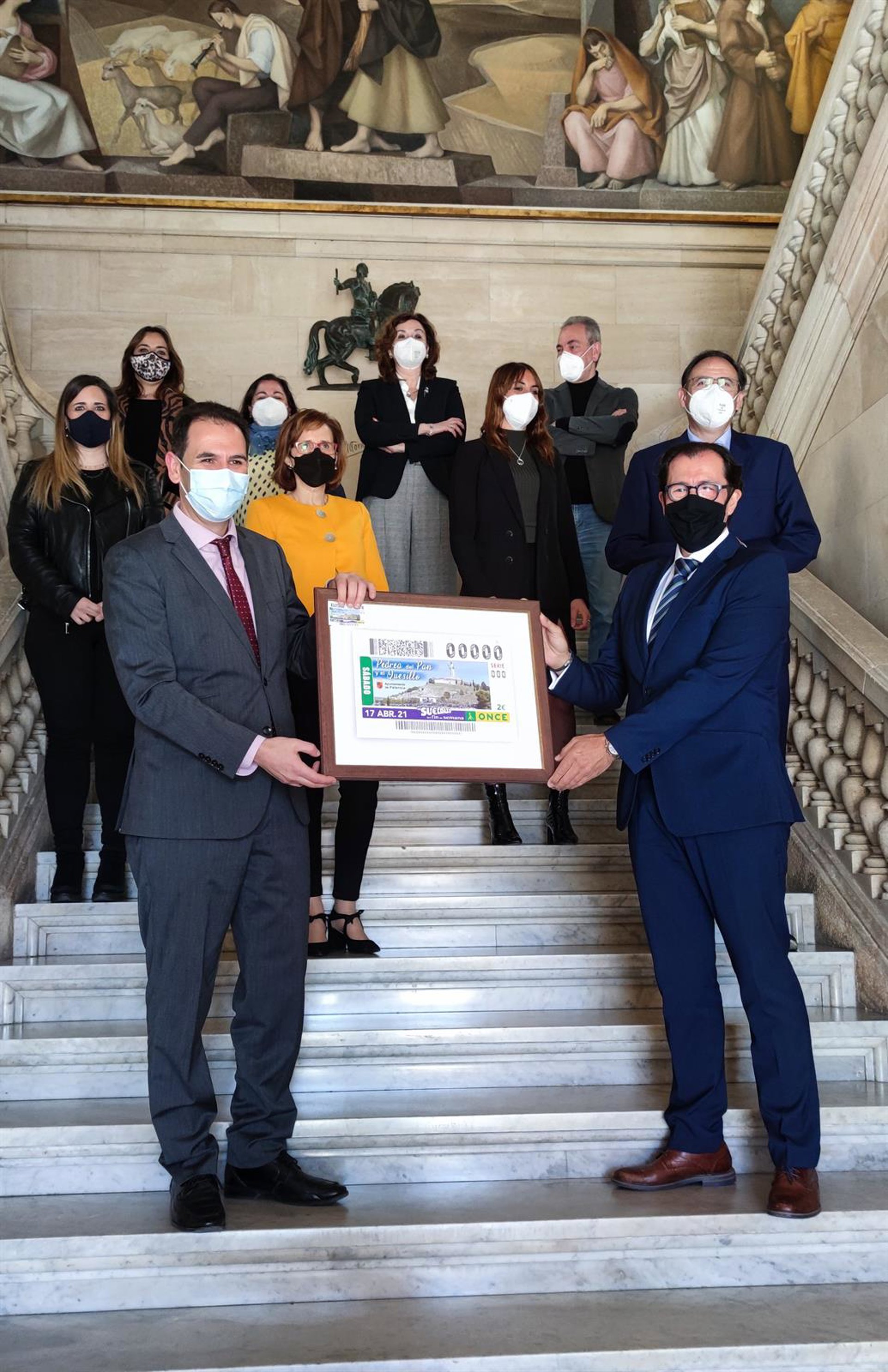 El alcalde de Palencia, Mario Simón, y el delegado territorial de la ONCE en Castilla y León, Ismael Pérez, han presentado este miércoles el cupón en un acto que ha tenido lugar en el Ayuntamiento de la capital, y en el que han estado acompañados por la presidenta del Consejo Territorial ONCE, Rosa Rubio; la directora de ONCE en Palencia, Paula Calvete; la concejal de Cultura, Laura Lombraña, y los portavoces de los grupos políticos, Alfonso Polanco (PP), Sonia Ordóñez (Ganemos Palencia), Sonia Lalanda (VOX), Miriam Andrés (PSOE), y Urbano Revilla (Cs).