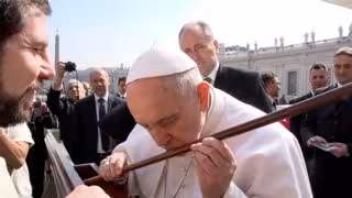 La peregrinación del 'Camino de Luz', que desde el 15 de octubre ha llevado el bastón original de Santa Teresa a 30 países de los cinco continentes, ha podido saludar este miércoles al Papa Francisco, en la plaza de San Pedro del Vaticano, donde el Pontífice ha besado esta reliquia.