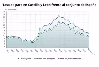 En comparación con el mismo trimestre del año anterior la evolución del paro en Castilla y León cayó un 1,85 por ciento (2.500 parados menos), por debajo de la media de España, donde esta evolución fue del -7,43 por ciento (259.500 desempleados menos).