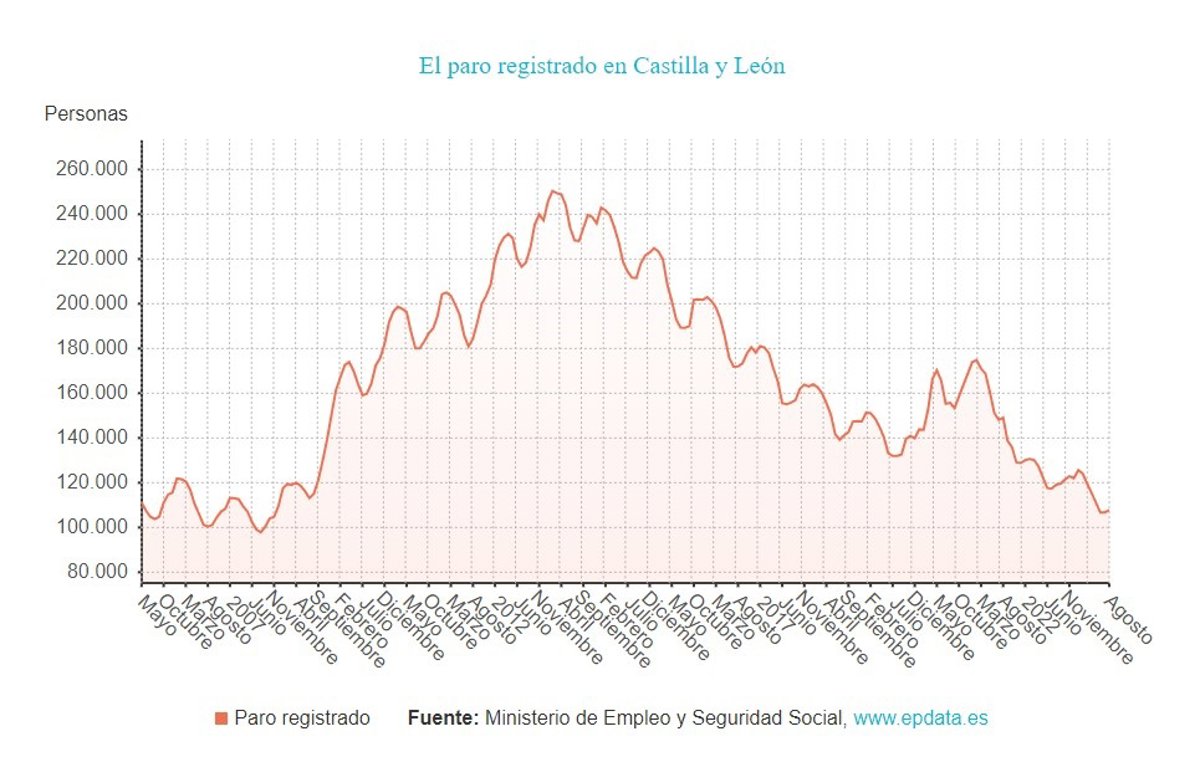 Y en comparación con agosto de 2022, el paro registrado en Castilla y León descendió un 9,53 por ciento (11.347 desempleados menos). En España el descenso es inferior, en concreto del 7,58 por ciento (el equivalente a 221.540 personas).