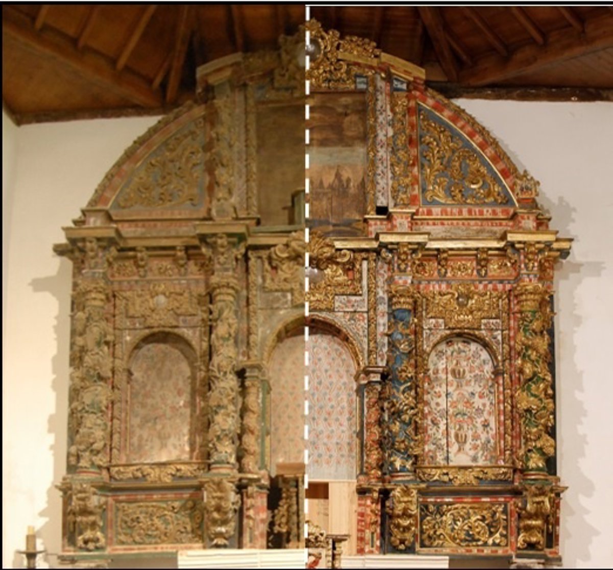 Una vez retirados los repintes y barnices y realizada la limpieza, se pueden observar los vivos colores originales de este retablo barroco de primera mitad del siglo XVIII.