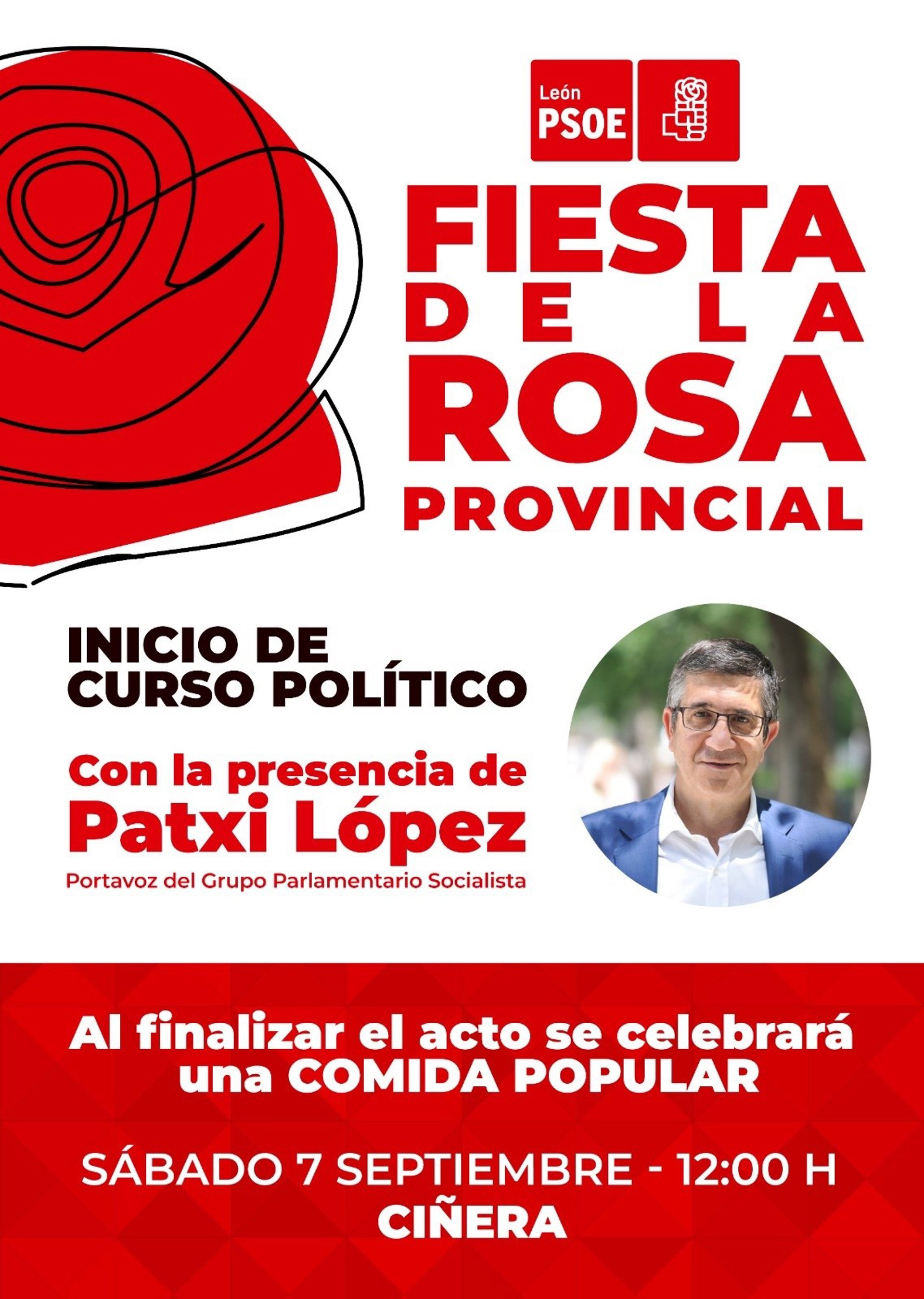 El portavoz del Grupo Parlamentario Socialista en el Congreso de los de los Diputados, Patxi López, participará el sábado 7 de septiembre en Ciñera (León) a partir de las 12.00 horas en la Fiesta de la Rosa, celebración de inicio del curso político del PSOE leonés.
