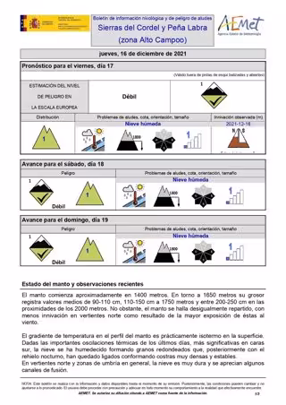 La Agencia Estatal de Meteorología (Aemet) prevé peligro de aludes de carácter débil este fin de semana en la Sierra de Guadarrama y en las sierras del Cordel y Peñalabra, en la zona de Alto Campoo.