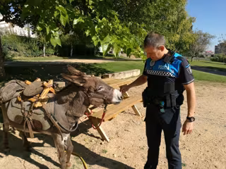 Al parecer, los agentes municipales encontraron el animal en un parque y, como se puede ver en las fotografías que adjunta la Policía Municipal en la red social, el pollino tenía colocada una silla de madera y otros elementos que se usan para montar y estaba atado a una mesa con una correa.