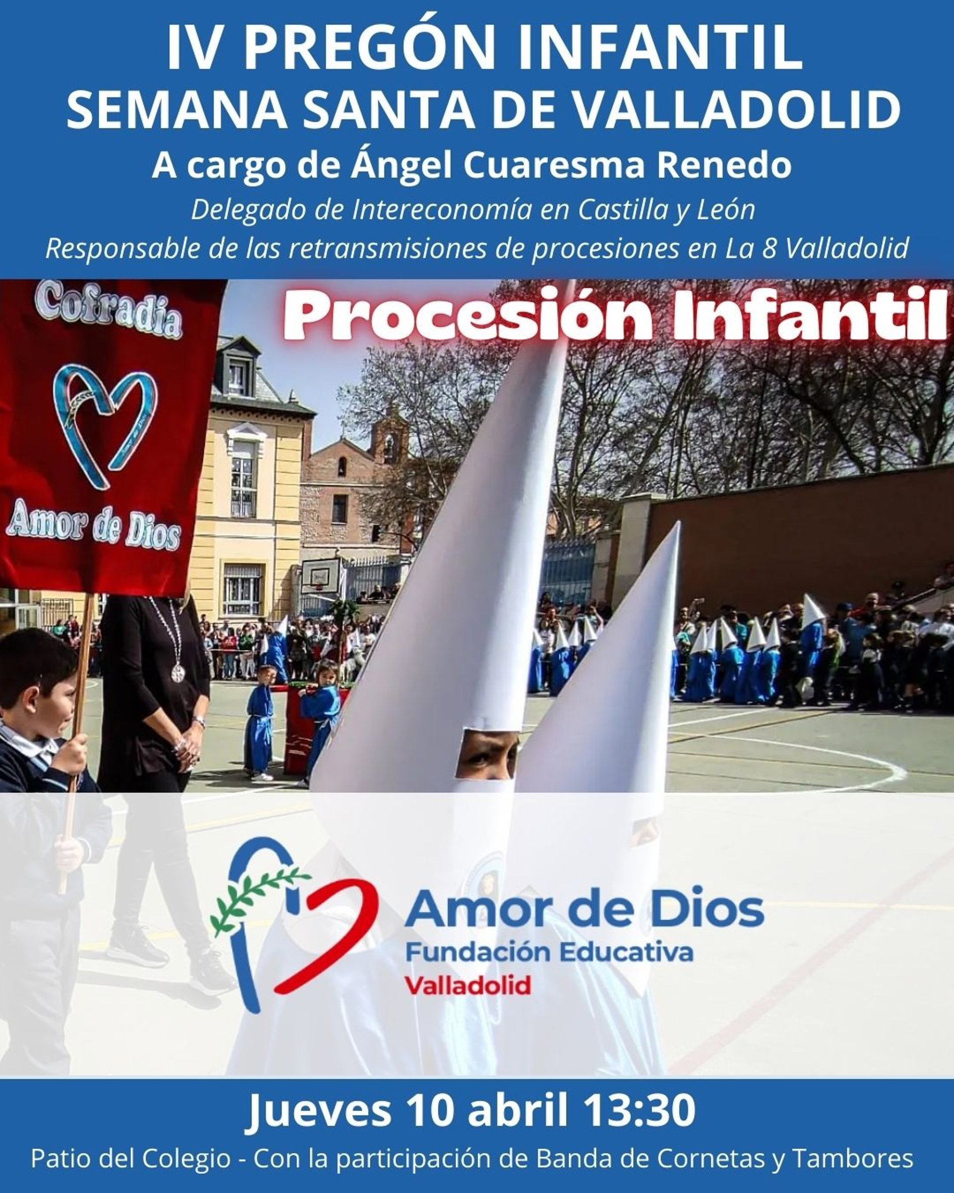 El periodista Ángel Cuaresma será el encargado de pronunciar el IV Pregón Infantil de la Semana Santa de Valladolid. El acto tendrá lugar el próximo jueves 10 de abril a las 13.30 horas en el patio del Colegio Amor de Dios, donde la pasión por la Semana Santa se vivirá con emoción al ritmo de las cornetas y tambores de la tradicional procesión infantil, según informó la asociación Valladolid Cofrade.
