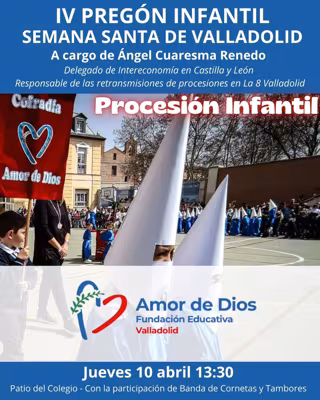 El Colegio Amor de Dios abrirá de nuevo las puertas a la Semana Santa de Valladolid con una procesión infantil compuesta por más de 200 alumnos, quienes lucirán sus hábitos de tela, cíngulo, capirote y medalla. En el cortejo se representarán escenas clásicas de la Semana Santa, como la entrada de Jesús en Jerusalén y el emotivo encuentro entre Jesús y la Virgen María. Tras el encuentro, se procederá a la lectura del pregón y al rezo correspondiente.