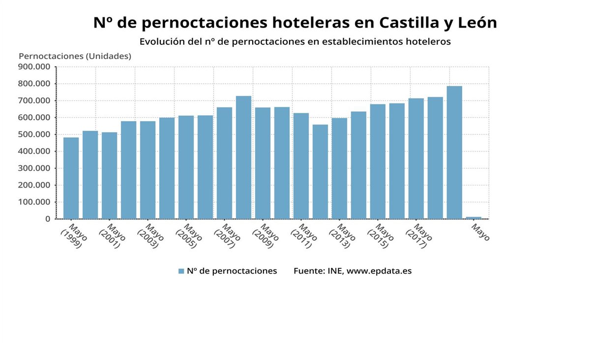 Las pernoctaciones en establecimientos hoteleros de Castilla y León se desplomaron un 98,32 por ciento en mayo respecto al mismo mes del año anterior y se quedaron en tan sólo 12.568 frente a las 750.992 registradas en mayo de 2019, según ha informado este martes el Instituto Nacional de Estadística (INE).