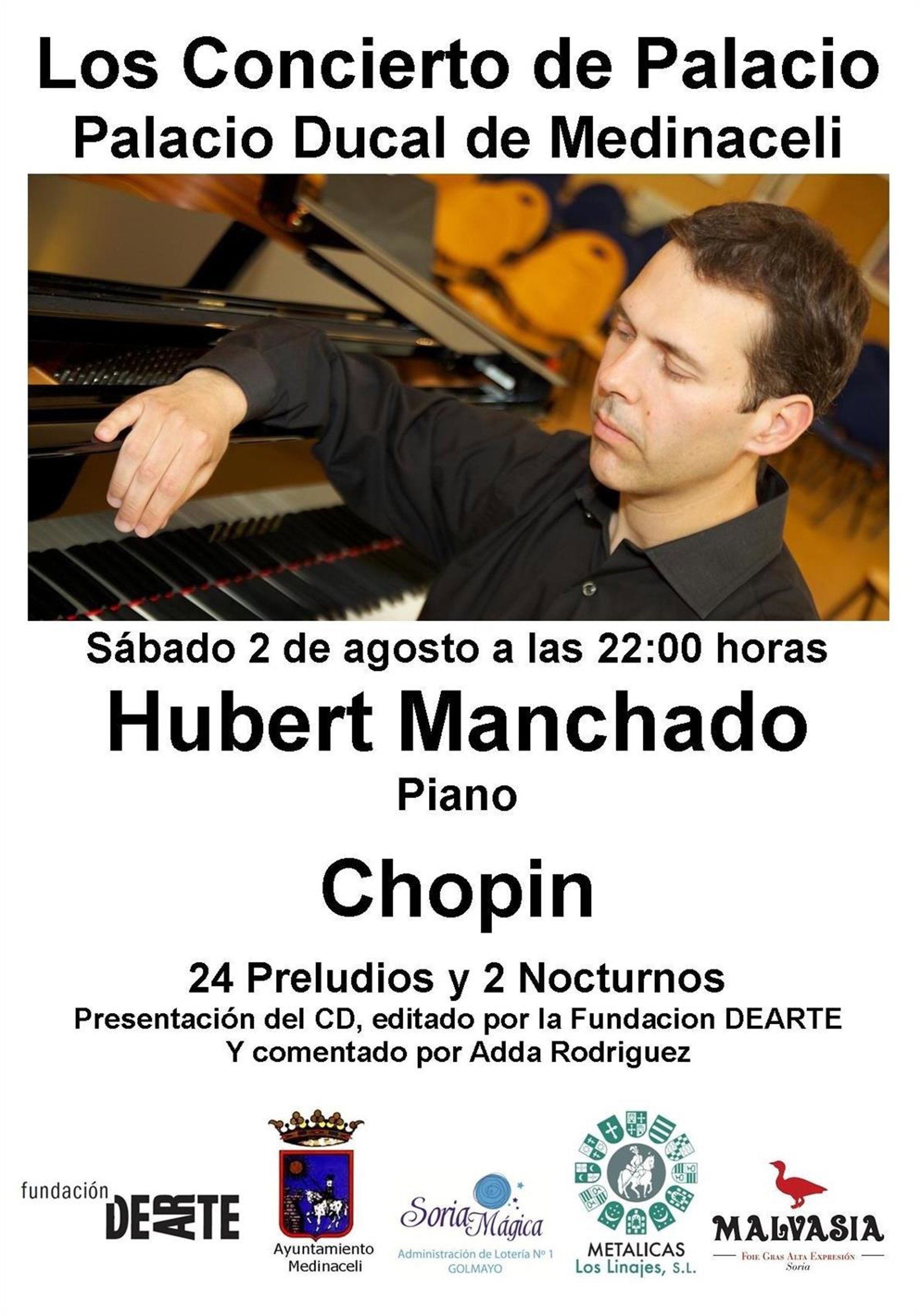 El pianista Hubert Manchado ofrecerá mañana sábado, 2 de agosto, una actuación dentro de la programación 'Los Conciertos de Palacio' del Palacio Ducal de Medinaceli (Soria) en el que interpretará los 24 Preludios de Chopin y 2 Nocturnos recogidos en un CD editado por la Fundación DEARTE.