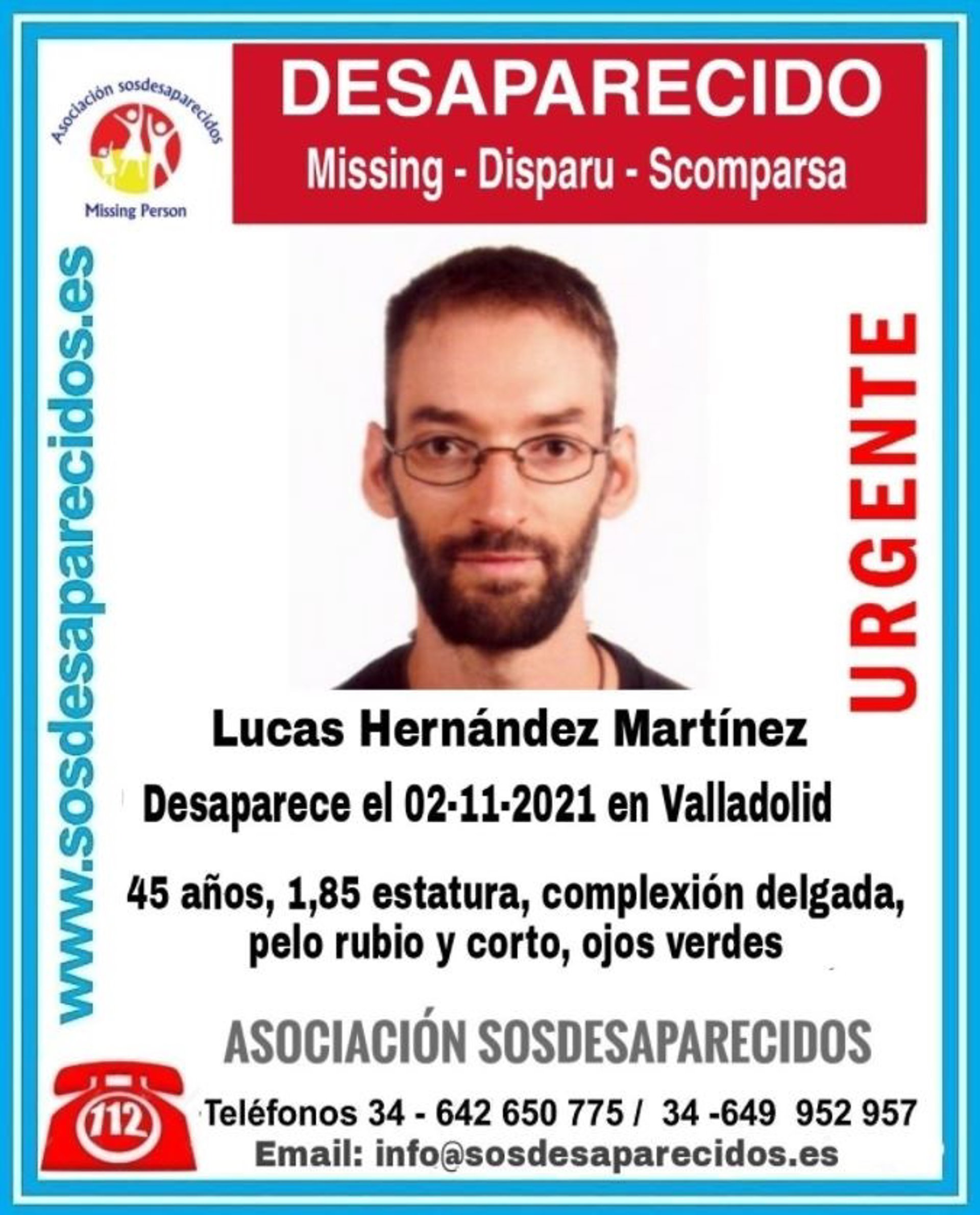 La plataforma 'SOS Desparecidos' ha solicitado la colaboración ciudadana para encontrar a Lucas Hernández Martínez, de 45 años y desaparecido desde el pasado 2 de noviembre en Valladolid capital.