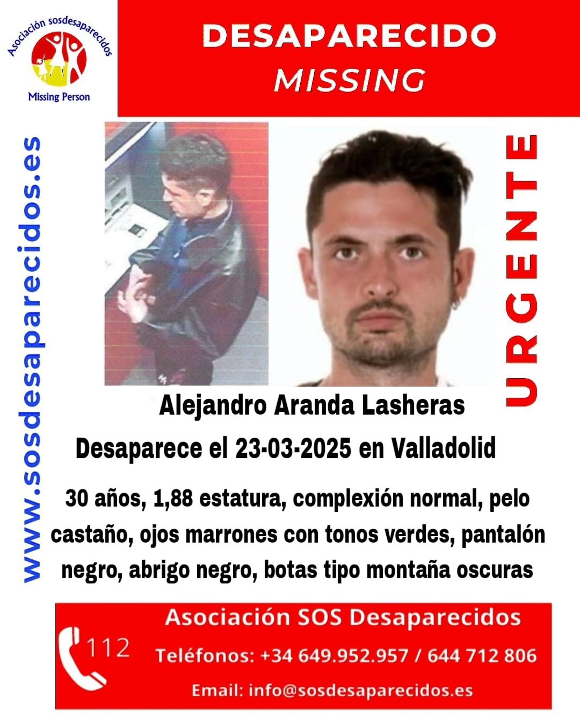 La familia de Alejandro Aranda Lasheras, el joven zaragozano de 30 años desaparecido el 23 de marzo en Valladolid, ha solicitado la colaboración de voluntarios con vehículos para ampliar la búsqueda en los municipios cercanos a la capital vallisoletana, así como la participación de cazadores, agricultores y senderistas familiarizados con la zona.