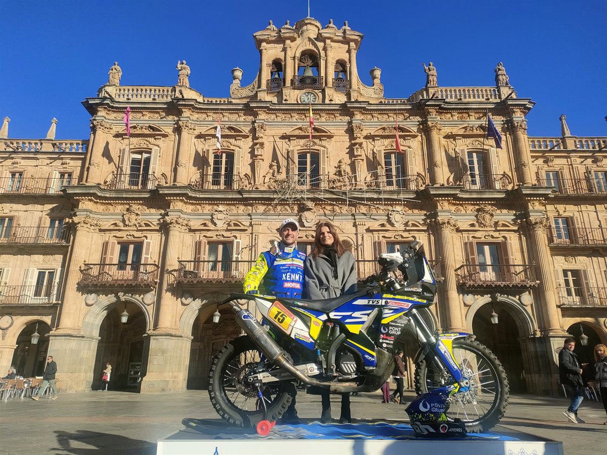 El piloto Lorenzo Santolino (i) junto a la concejal de Deportes del Ayuntamiento de Salamanca, Almudena Parres (d), en la Plaza Mayor de Salamanca - EUROPA PRESS