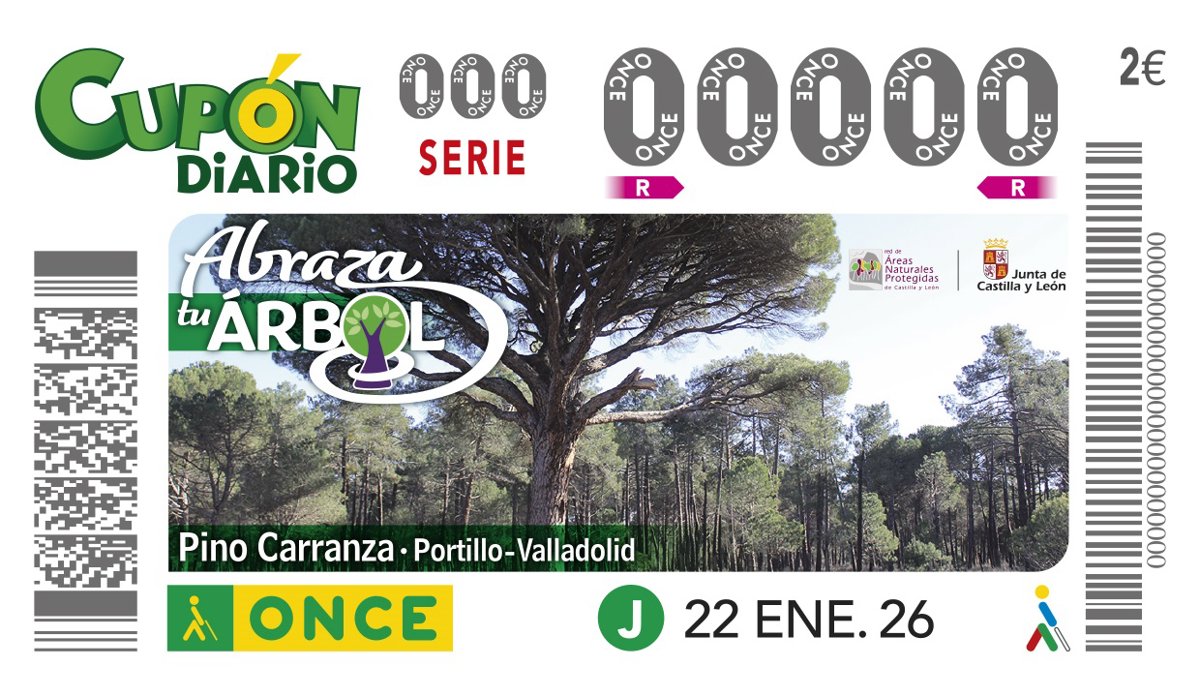 VALLADOLID 20 Ene. (EUROPA PRESS) - Cinco millones de cupones llevarán la imagen del Pino Carranza de Portillo (Valladolid) en el sorteo de este jueves, 22 de febrero, y dentro de la serie 'Abraza tu árbol' dedicada por la Organización Nacional de Ciegos (ONCE).