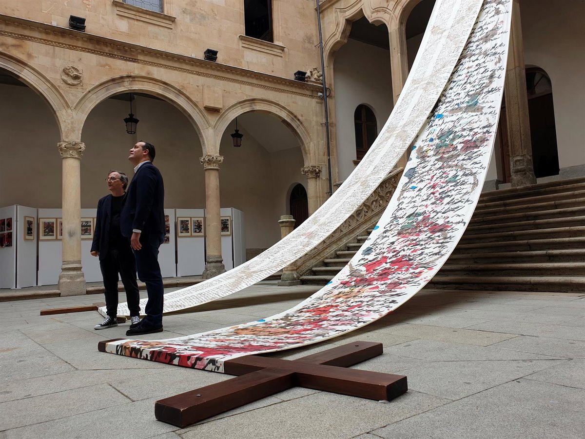 Así ha llevado a cabo una serie de 133 obras, de las que una selección se puede ver ahora en el Patio de La Salina, entre ellas dos grandes lienzos que cuelgan de la fachada del claustro y que descansan sobre dos cruces de penitencia de la Semana Santa de Salamanca.