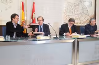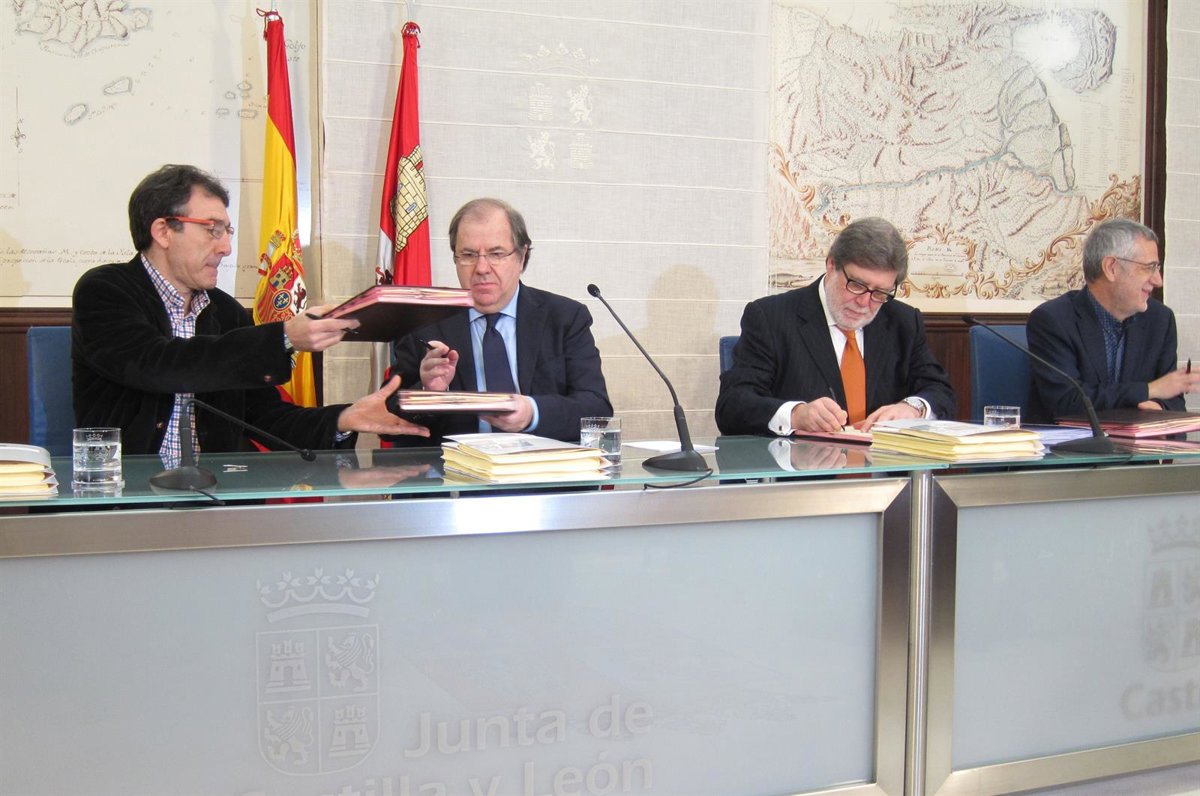 El presidente de la Junta, Juan Vicente Herrera, ha explicado las líneas básicas de este acuerdo que se incluye entre los firmados hoy en el marco del Diálogo Social con los secretarios autonómicos de CC.OO y UGT, Ángel Hernández y Agustín Prieto, y el presidente de Cecale, Santiago Aparicio.