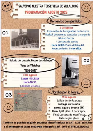 La primera de las actividades, enmarcadas en la Semana Cultural organizada por la asociación 'Las Pandas', tendrá lugar el 2 de agosto a las 22.00 horas con la inauguración de la exposición 'Momentos compartidos' en la plaza de detrás del Ayuntamiento del municipio, una selección de fotografías con la torre como elemento central que han sido seleccionadas por vecinos de la localidad y otras recuperadas del grupo de Facebook 'Cultural Vega', informan desde la organización a Europa Press.