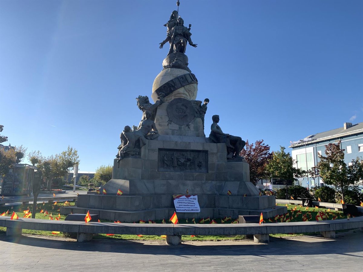 La plaza de Colón de Valladolid ha amanecido este lunes, Día de la Fiesta Nacional, con decenas de 'banderitas' de España colocadas en la estatua y clavadas en la tierra de las jardineras que la rodean, además de con una pancarta en la que se recuerda a las "832" víctimas que señalan que ha dejado, hasta ahora, el COVID-19 en la provincia.