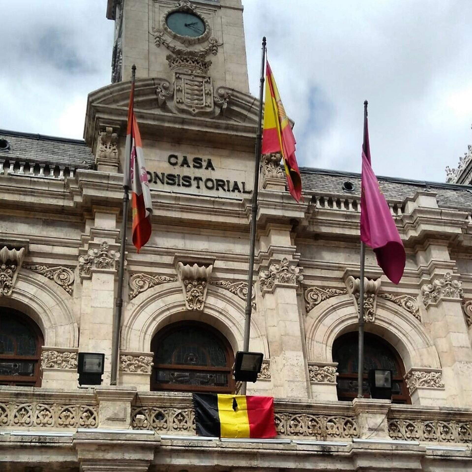 El balcón principal de la fachada de la Casa Consistorial vallisoletana luce también desde primera hora de la tarde de este martes una bandera belga con un crespón negro en señal de dolor por las víctimas.