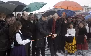 El acto de inauguración se celebró después de la misa dominical y en un mediodía con nieve y lluvia, que redujo los actos previstos, pero que no impidió la concentración de vecinos y autoridades con paraguas, que recorrieron el remodelado espacio urbano del centro pueblo y degustaron productos de la tierra (ojuelas, vinos y refrescos) en un ambiente de convivencia.