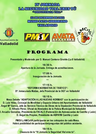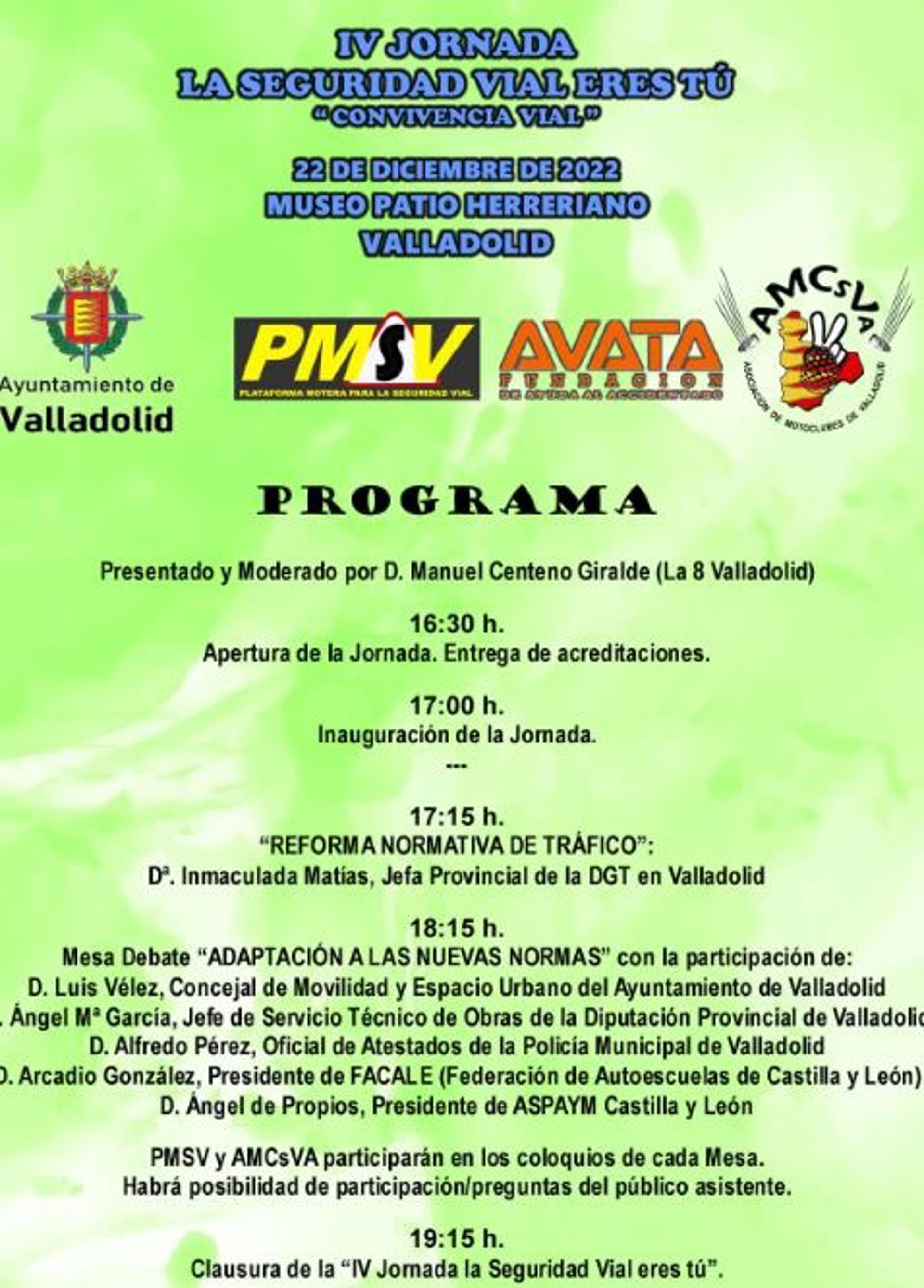 La Plataforma Motera para la Seguridad Vial (PMSV), Asociación de Víctimas de Accidentes de Tráfico (Avata) y la Asociación de Motoclubes de Valladolid (Amcsva), ha organizado para le próximo jueves, 22 de diciembre, la IV Jornada sobre Seguridad Vial en la que se debatirá sobre la última reforma de la normativa de Tráfico.