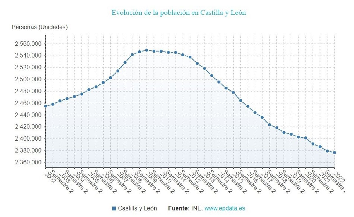 En concreto y según las cifras de población a 1 de enero de 2022 publicadas este martes por el INE y consultadas por Europa Press, la población residente en Castilla y León a 1 de enero de 2022 era de 2.376.739 habitantes, frente a los 2.386.649 a 1 de enero de 2021, lo que supone 9.910 habitantes menos.