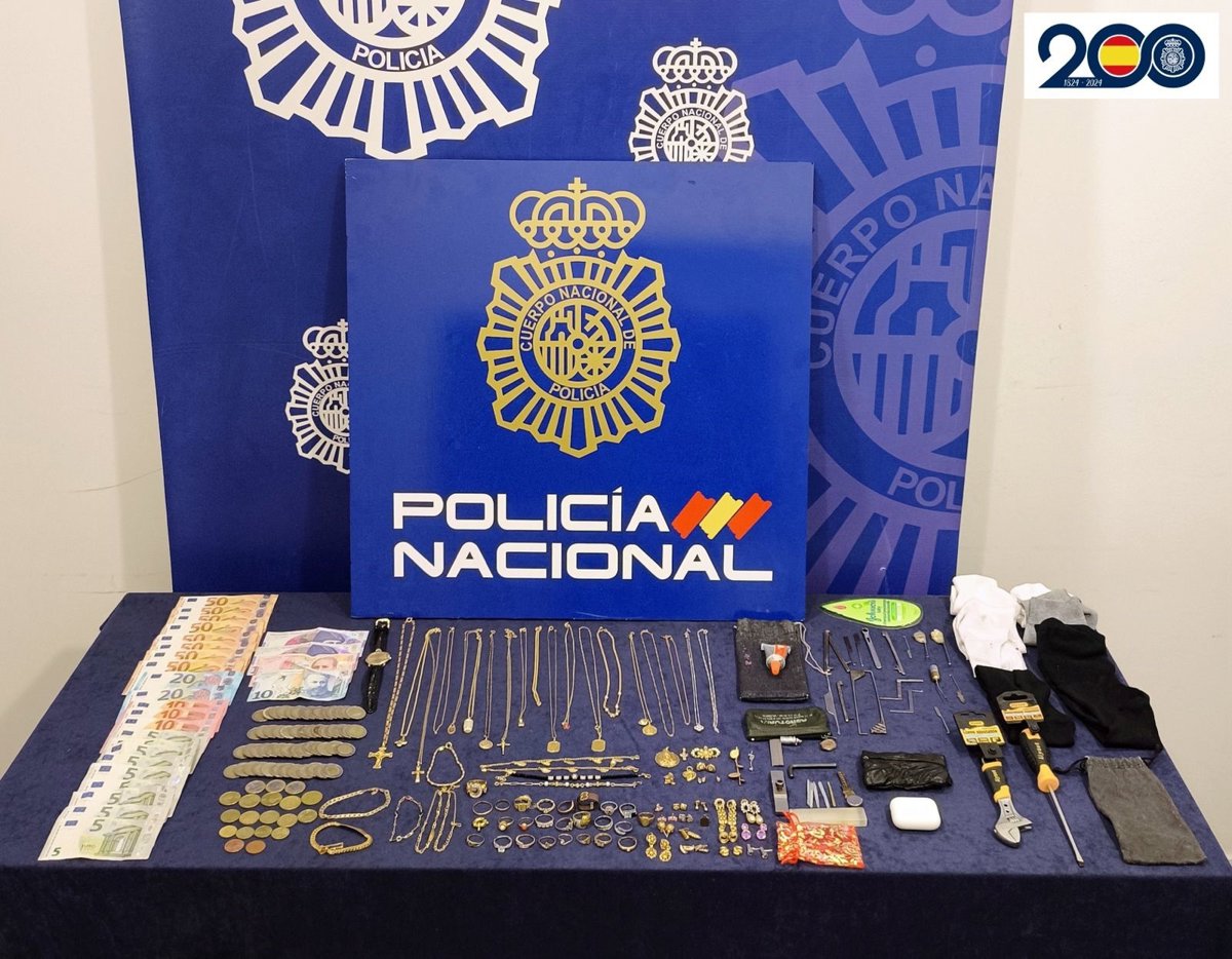 Horas más tarde, observaron a un hombre saliendo de uno de los edificios, que actuaba de forma vigilante. Tras asegurar la zona, los agentes procedieron a interceptarlo cuando se dirigía hacia una zona ajardinada, donde escondía diversos objetos. Entre ellos, localizaron herramientas para la apertura de puertas y varios calcetines llenos de joyas, por lo que fue detenido en el acto.