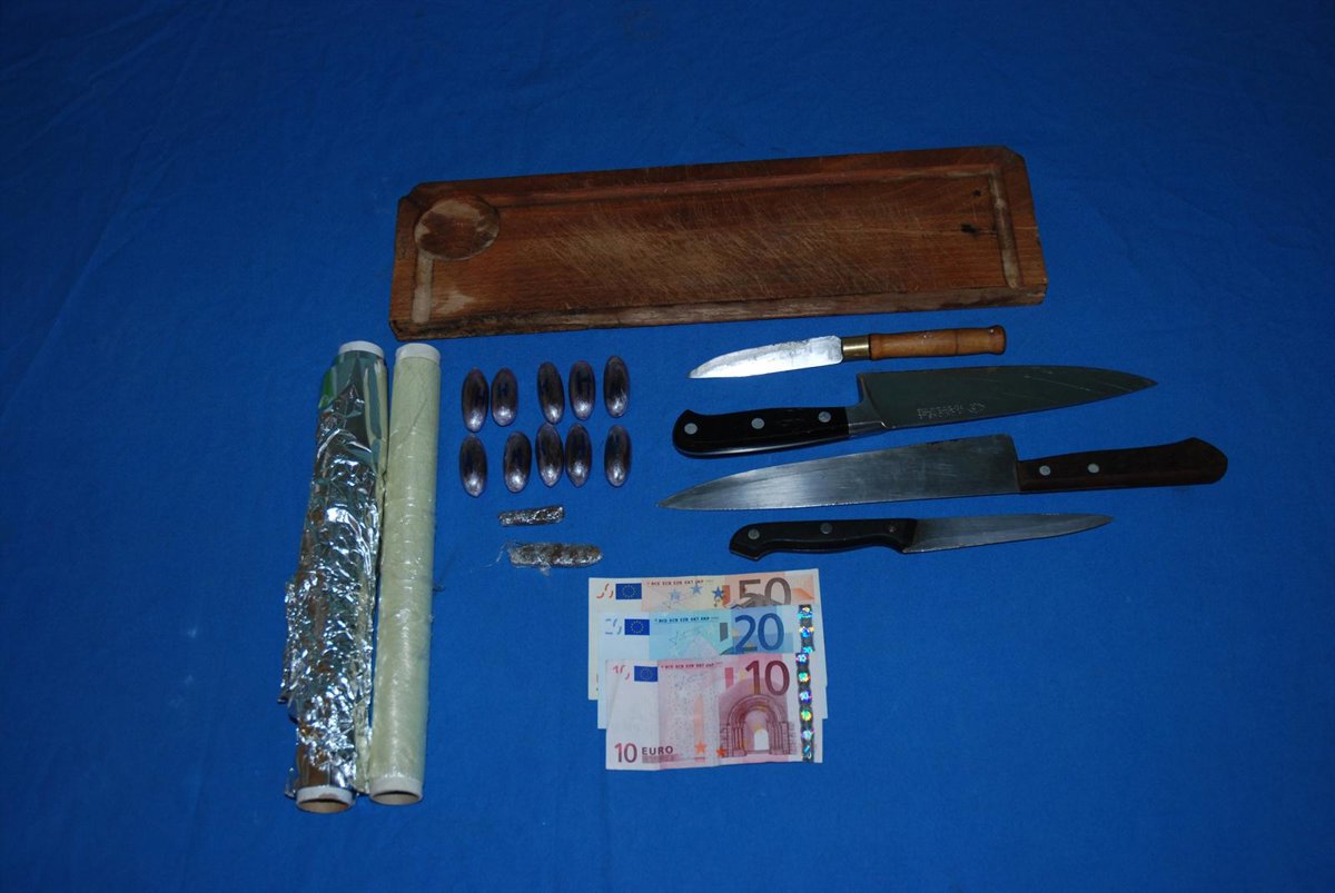 Al realizar la inspección, se incautaron de 106 gramos de hachís, cuatro cuchillos con restos de sustancia estupefaciente, así como una tabla también con restos y un rollo de papel de aluminio, todo ello en la cocina.