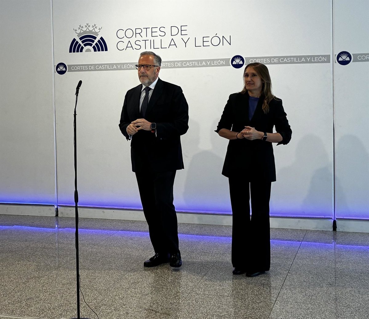 Carlos Pollán y Rocío Lucas, antes de antender a los medios hoy en las Cortes. - EUROPA PRESS
