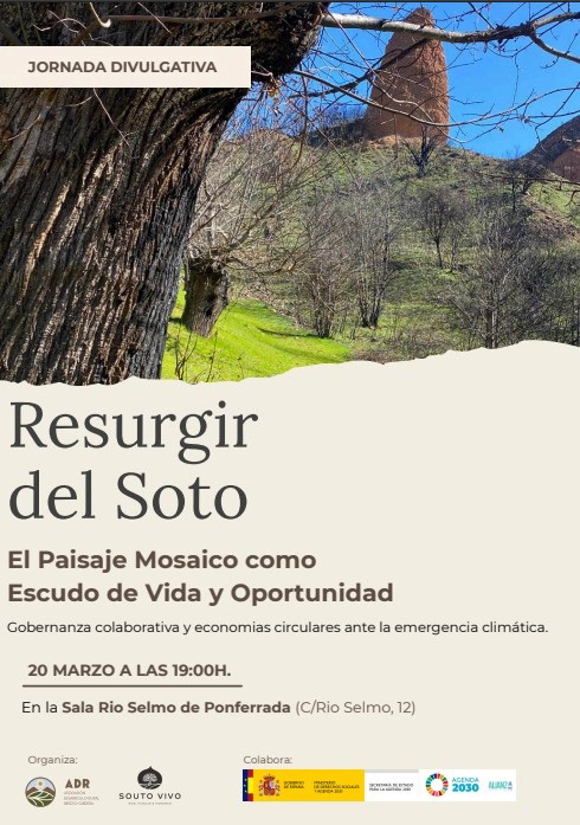 Cartel de la jornada abierta 'Resurgir del Soto: El Paisaje Mosaico como Escudo de Vida y Oportunidad' que se celebrará mañana en Ponferrada (León). - ADR BIERZO-CABRERA