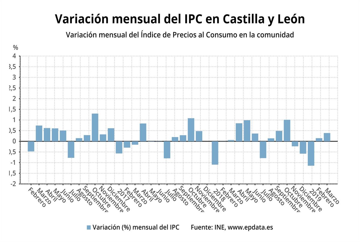 El Índice de Precios de Consumo (IPC) subió cuatro décimas en marzo respecto al mes anterior, como en España y la tasa interanual (es decir, la variación de los precios registrada durante los últimos doce meses) subió hasta el 1,6 por ciento en Castilla y León, tres décimas más que en el resto del país (1,3 por ciento) y tres décimas más también que el mes anterior, según los datos hechos públicos por el Instituto Nacional de Estadística (INE) y recogidos por Europa Press.