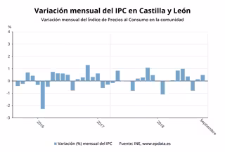 El Índice de Precios de Consumo (IPC) subió medio punto en septiembre respecto al mes anterior, tres décimas más que en España (0,2 por ciento), y la tasa interanual (es decir, la variación de los precios durante los últimos doce meses) escala al 2,6 por ciento en Castilla y León, tres décimas más que en el resto del país (2,3 por ciento) y dos décimas más respecto al mes anterior, según los datos hechos públicos por el Instituto Nacional de Estadística (INE) y recogidos por Europa Press.