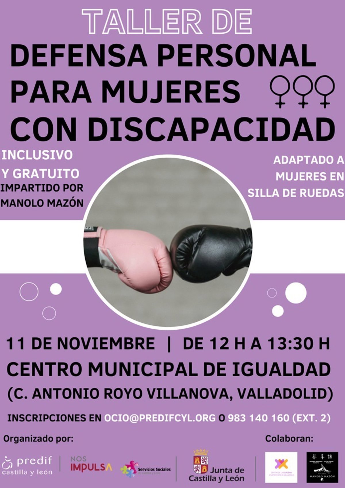 La Plataforma Representativa Estatal de Personas con Discapacidad Física de Castilla y León (PREDIF) ha organizado un taller inclusivo de defensa personal dirigido a mujeres con discapacidad el próximo viernes, 11 de noviembre, a las 12:00 horas en el Centro Municipal de Igualdad de Valladolid (c/ Antonio Royo Villanova, s/n), que cuenta con el apoyo de la Gerencia de Servicios Sociales de la Consejería de Familia e Igualdad de Oportunidades de la Junta de Castilla y León.
