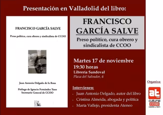 La librería Sandoval de Valladolid acoge mañana martes la presentación del libro sobre el sindicalista de CCOO y cura Francisco García Salve en un acto que contará con la presencia de Juan Antonio Delgado, el autor del texto, y de la política y abogada Cristina Almeida.