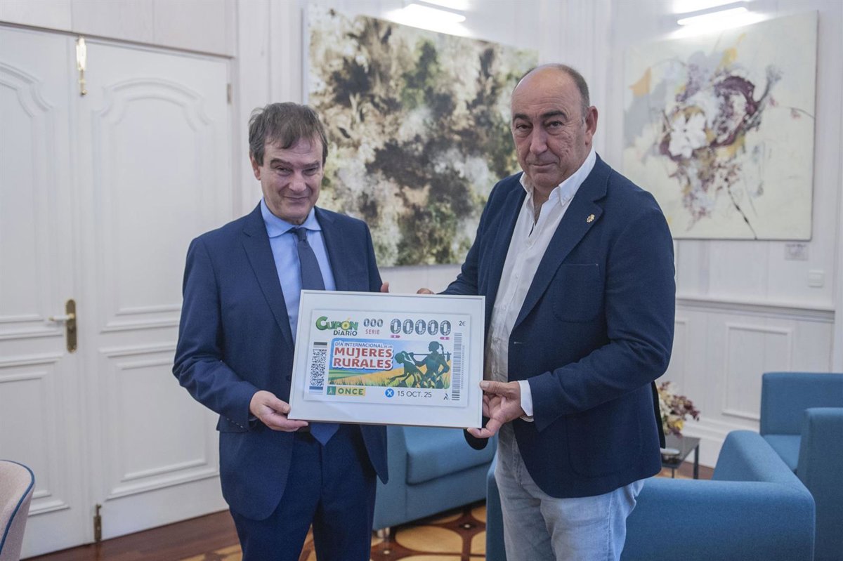 El director de la ONCE en Segovia, Claudio Congosto, y el presidente de la Diputación de Segovia, Miguel Ángel de Vicente, han presentado este cupón, con el que la ONCE quiere destacar la importancia de la aportación económica, social y cultural que desarrollan las mujeres en áreas rurales y su decisiva contribución a la seguridad alimentaria, al bienestar y a construir sociedades mejores.