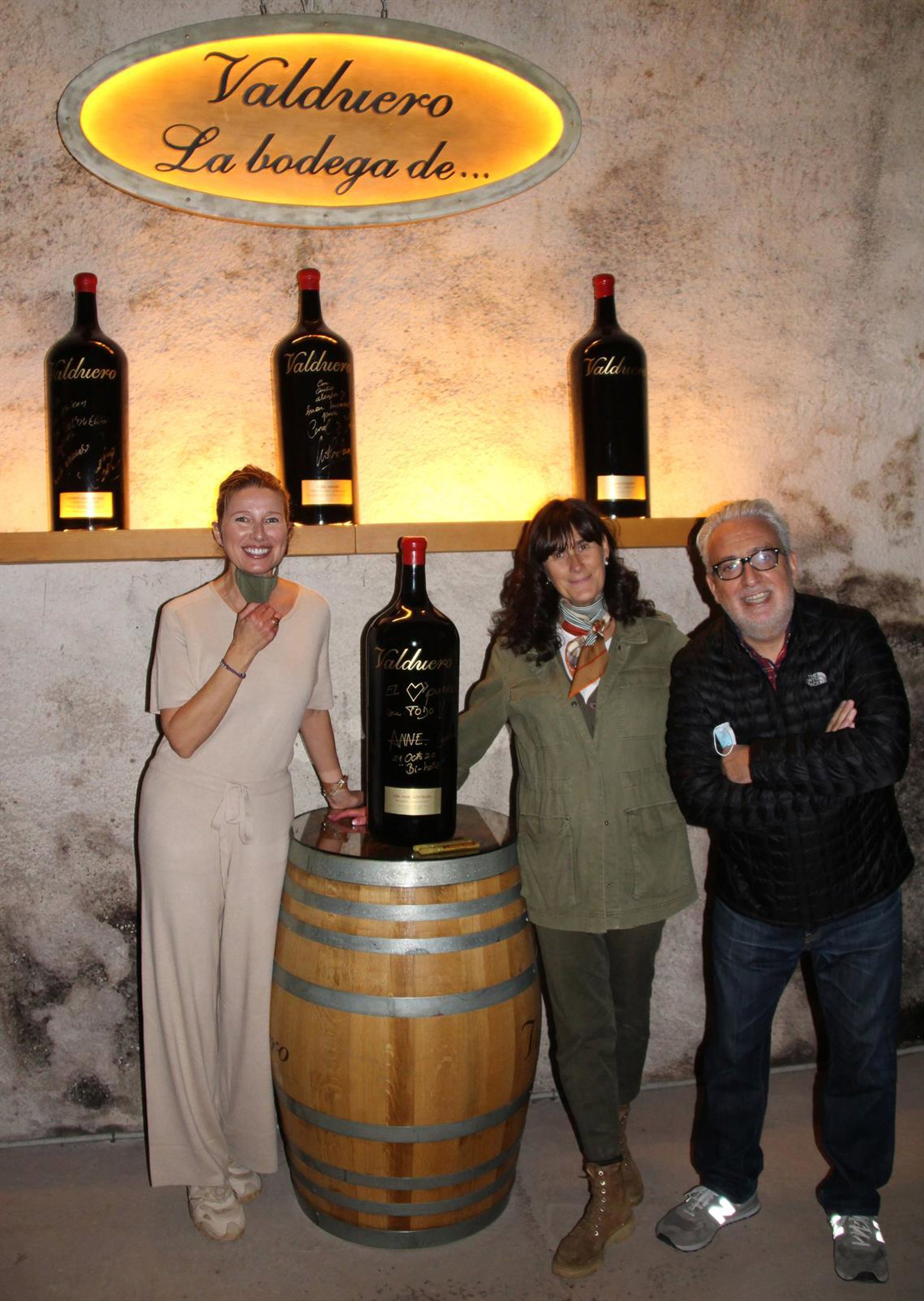 Anne Igartiburu (I), junto a Leo Harlem (D) y una de las propiestarias de la bodega Valduero. - BODEGA VALDUERO