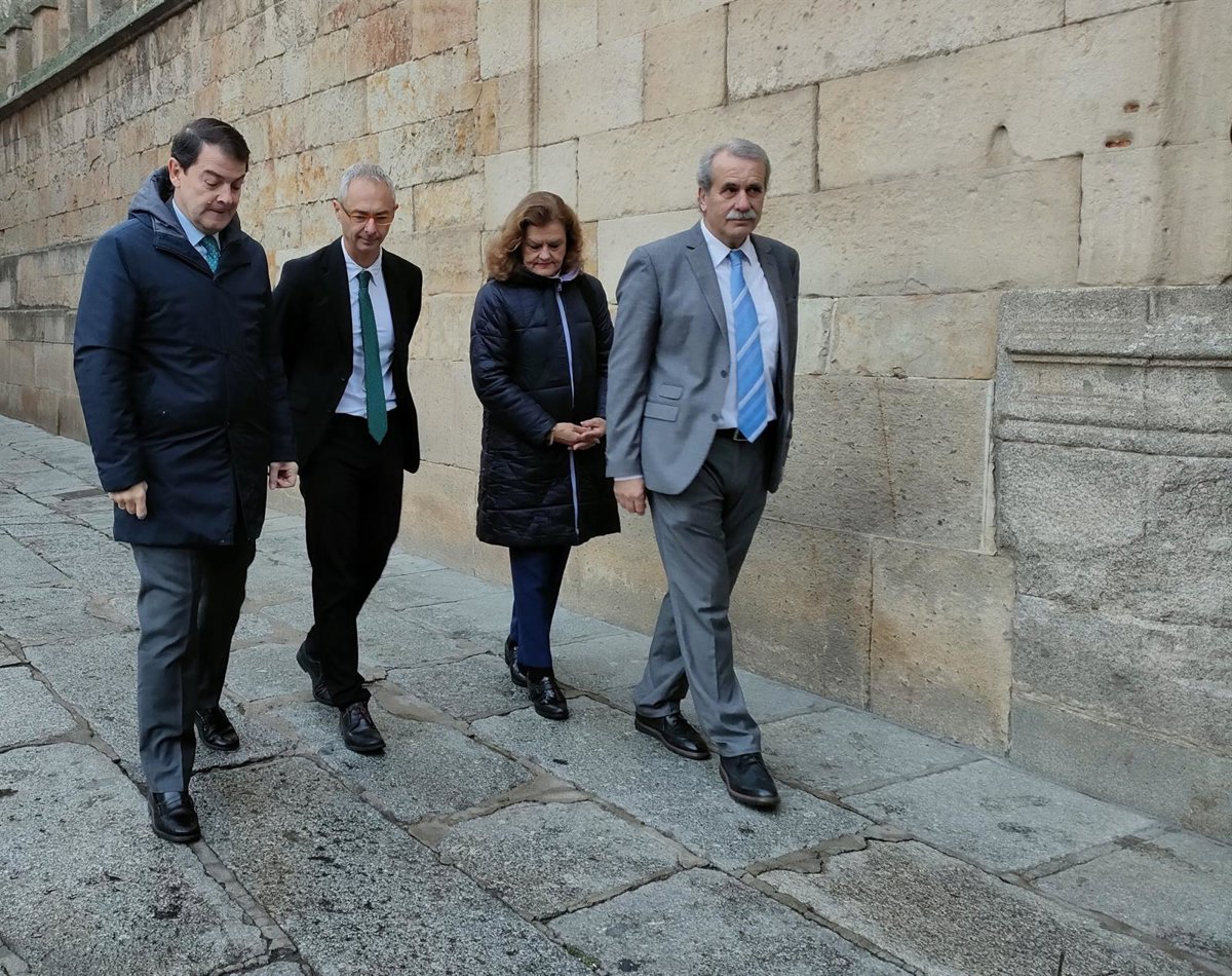 El presidente del Consejo Consultivo de CyL, Agustín Sánchez de Vega, primero por la derecha, a su llegada al Edificio Histórico de la USAL para participar en las jornadas - EUROPA PRESS